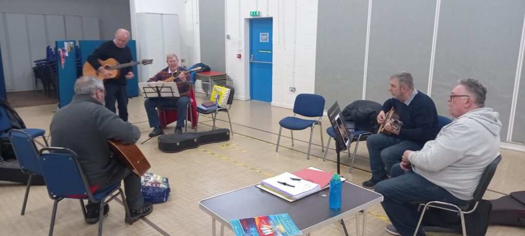 We continue to meet on Fridays at lunch time and have between six and nine people attending. We each play a song in turn mixed with discussions about the songs we play. Everyone seems to really enjoy and value the sessions. It keeps our interest, motivation and learning going. New members will be made very welcome.